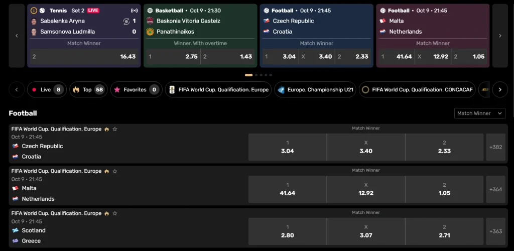En Fairspin, no solo te ofrecemos una amplia variedad de eventos deportivos, sino también una experiencia de usuario inigualable. Nuestra plataforma de Fairspin sports betting está diseñada para ser intuitiva y fácil de usar, permitiéndote navegar rápidamente entre eventos en vivo y pre-partido. Gracias a nuestra interfaz de Altenar, tendrás acceso a estadísticas detalladas, análisis en tiempo real y gráficos interactivos que te ayudarán a tomar las decisiones más inteligentes. Ya seas un apostador novato o un profesional experimentado, nuestra plataforma te da las herramientas que necesitas para apostar con confianza y conocimiento.